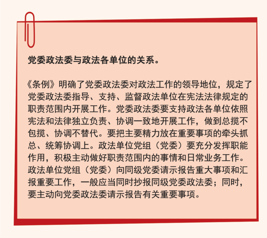 《条例》明确规定,党委政法委是党委领导和管理政法工作的职能部门,是实现党对政法工作领导的重要组织形式;政法单位是党领导下从事政法工作的专门力量,主要包括审判机关、检察机关、公安机关、国家安全机关、司法行政机关等单位。做好新时代政法工作,既需要各主体履行好各自职责,也需要处理好“上下左右”的关系。