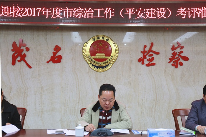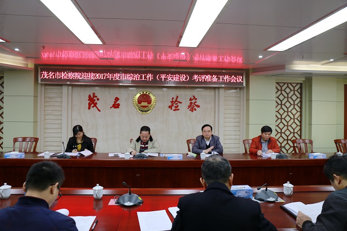 12月21日上午,茂名市检察院在四楼会议室召开2017年度迎接市综治工作(平安建设)考评准备工作会议。茂名市检察院党组成员、副检察长朱冠恒,专职委员谭伟辉,各部门负责人和内勤,以及侦监科相关干警参加了会议。会议由侦监科科长吴学翔主持。