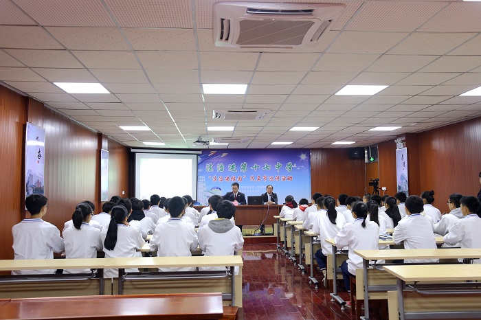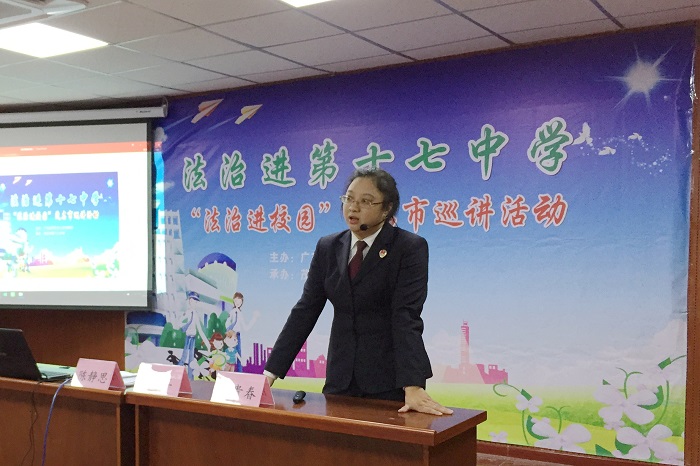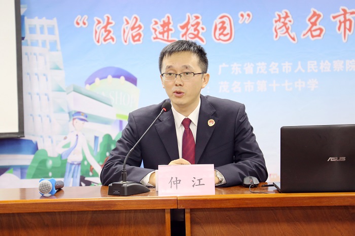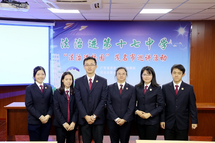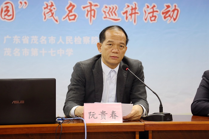 2017年12月15日晚,茂名市检察院“法治进校园”巡讲团在茂名市检察院未检办负责人仲江的带领下走进茂名市第十七中学,运用互联网技术同步直播,为茂名市第十七中学东西两个校区共5000多名师生同时开展一场法治讲座,茂名市第十七中学校长阮贵春参加了此次活动并发表讲话。