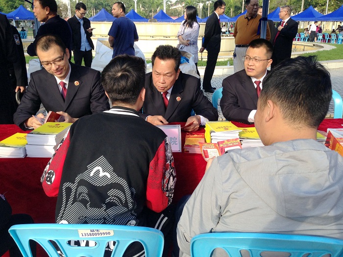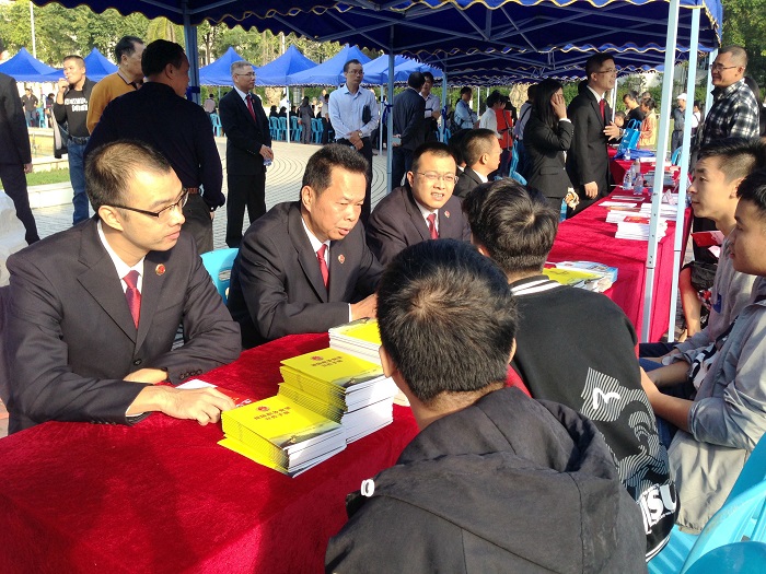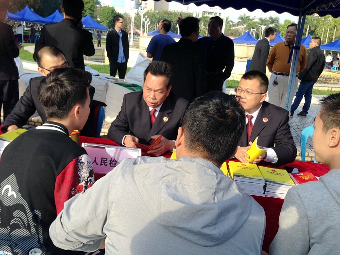 12月4日上午,茂名市中心广场上设立了充气拱门,茂名市检察院与茂名市国土局、住建局、房产局、公路局等40家单位在广场上设置了咨询台,工作人员通过派发法律读本、普法知识手册等方式,向过往群众宣传法律知识,现场的免费法律咨询台也被群众团团围住,纷纷要求解答法律上的疑难问题。