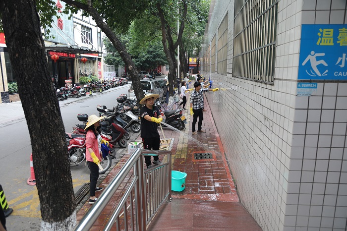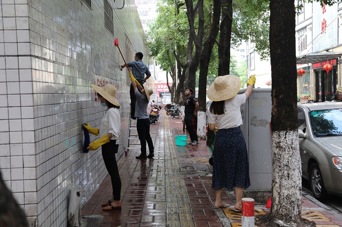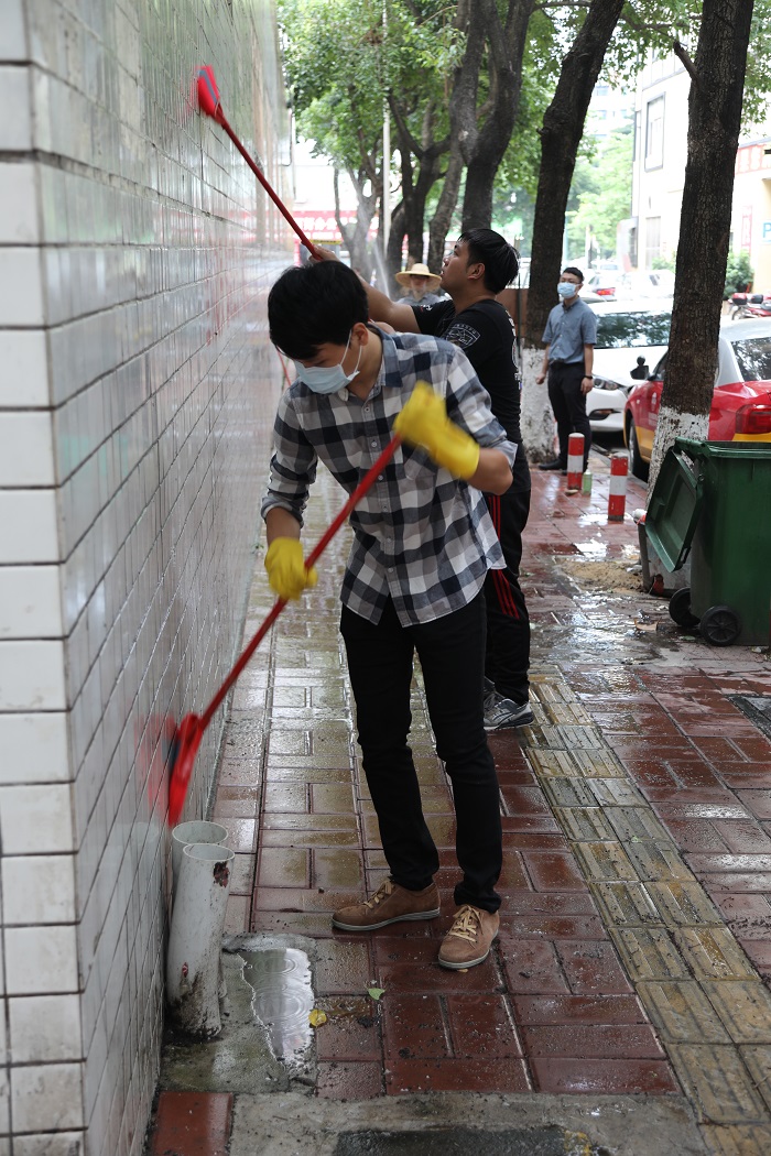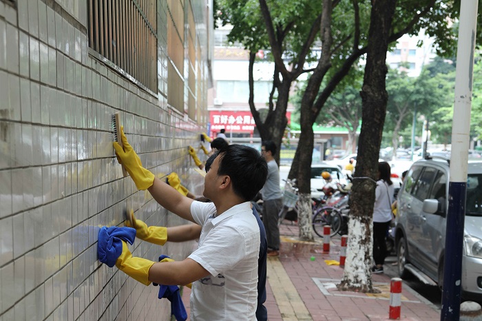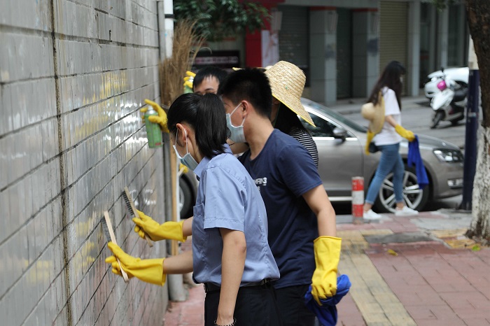 有了先前环卫工人和保洁阿姨们的辛勤劳动,原来遍布四面围墙的小广告已经基本清除干净,但是还有留下了不少不干胶痕迹,这些旧痕清理起来难度可一点不比纸广告小,要用专门的清洁剂加上水才能刷掉,小伙伴们处理起来自然是一丝不苟。