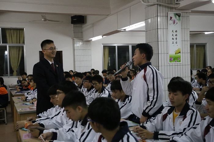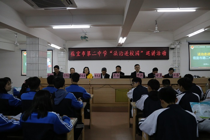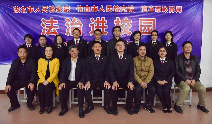 1月10日晚,茂名市检察院联合信宜市检察院到信宜市第二中学,开展“法治进校园”巡讲活动。茂名市检察院未检办负责人仲江为该校400多名师生上了一堂主题为“拒绝校园欺凌,远离违法犯罪”的法治课。信宜市检察院党组成员、副检察长吴劲,信宜市教育局副局长甘勇,信宜市第二中学校长黄凤著等师生代表出席活动。
