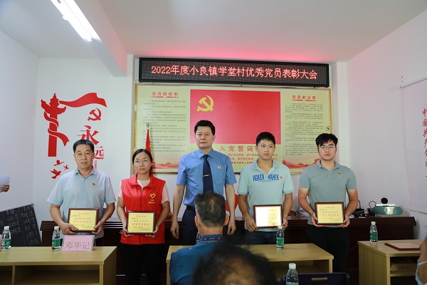 邓峰主任向获得2022年度学堂村党总支优秀党员称号的同志颁发了奖牌。