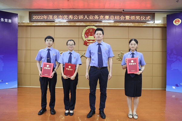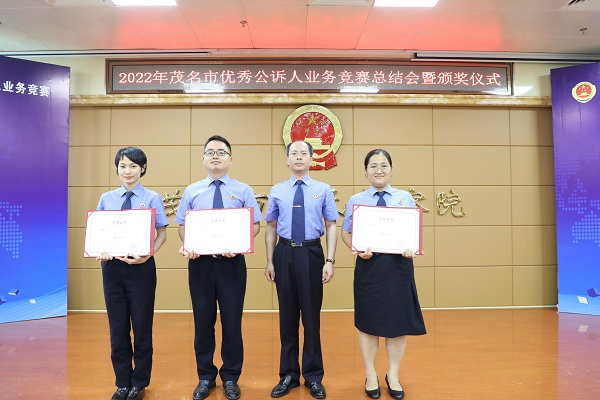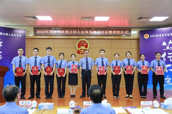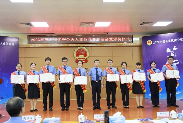 颁奖仪式上,茂名市检察院党组成员、政治部主任邓峰宣布获奖名单,并为“优秀组织奖”“初生牛犊奖”的获奖单位和选手颁奖。茂名市检察院党组成员、副检察长黄兵国为获得“神笔奖”“优秀论辩奖”“最佳论辩奖”的选手颁奖。茂名市检察院党组成员、副检察长郑硕成为获得“优秀公诉人提名奖”的选手颁奖。茂名市检察院党组书记、检察长王辉华为获得“优秀公诉人”称号的选手颁奖。