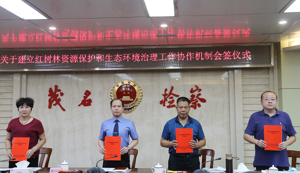 为充分发挥检察机关法律监督职能和行政机关行政执法职能,协同推进红树林资源保护和生态环境治理,共同绘就红树葱郁、鹭鸟翔舞的红树林生态画卷,8月4日,茂名市检察院联合市林业局、市农业农村局、市自然资源局在市检察院举行《茂名市人民检察院 茂名市林业局 茂名市农业农村局 茂名市自然资源局关于建立红树林资源保护和生态环境治理工作协作机制的意见》联签仪式,并召开座谈会。市检察院党组成员、副检察长黄兵国、市农业农村局副局长黄卫清、市自然资源局四级调研员杨森、市林业局四级调研员江雪梅出席活动并作讲话。市检察院第四检察部以及相关部门工作人员参加活动。